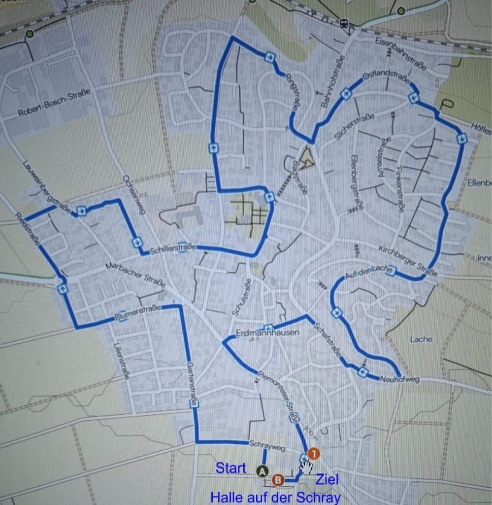 Schrayweg, Gartenstr., Blumenstraße, Hardtstraße, Riedstr., Lauweinberstr., Uhlandstr., Schillerstr., Friedhofstr., Mörikestr., Kirchenfeldstr., Am Wachtelrain, Ringst., Sommerhaldenstr., Ostlandstr., Hermann-Pfähler Str., Auf der Lache, Neuhofweg, Schafstr., Pflasterstr., Piemonteser Str und wieder zum Parkplatz Halle auf der Schray zurück.